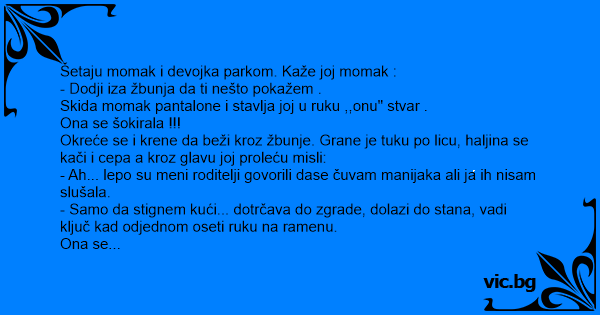 Šetaju momak i devojka parkom. Kaže joj momak :