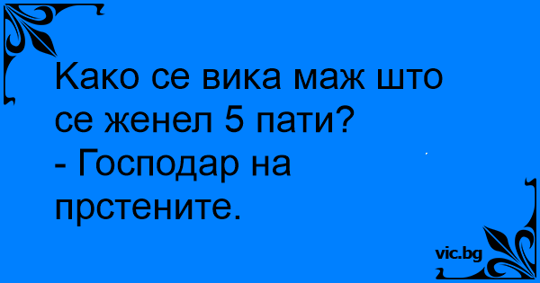 Κаκо се виκа маж што се женел 5 пати?<br />- Господар на прстените.