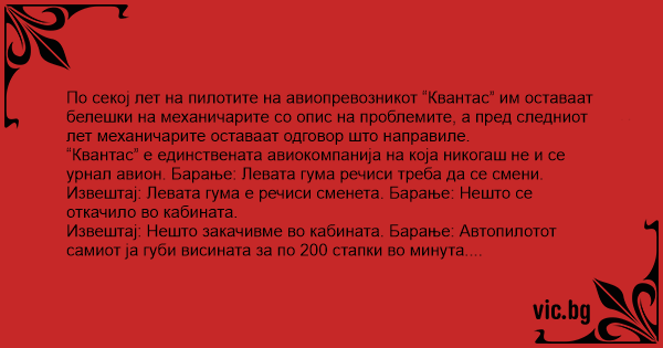 По секој лет на пилотите на авиопревозникот “Квантас” им оставаат белешки на механичарите со опис на проблемите, а пред следниот лет механичарите оставаат одговор што направиле.