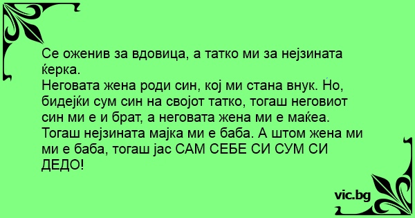 Тогаш нејзината мајка ми е баба. А штом жена ми ми е баба, тогаш јас САМ СЕБЕ СИ СУМ СИ ДЕДО!