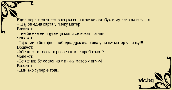 Еден нервозен човек влегува во патнички автобус и му вика на возачот: