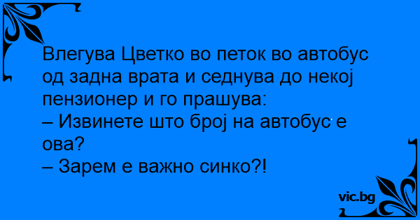 Влегува Цветко во петок во автобус од задна врата и седнува до некој пензионер и го прашува: