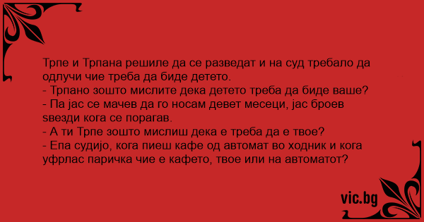 Válóperes tárgyaláson veszekszik a férj és a feleség, hogy kinél maradjon a gyerek. Elsőnek a feleség kapja meg a szót : - Én szültem, tehát az enyém. Mire a férj a bíróhoz fordul. - Tisztelt bíró... Der var stor ståhej i det lille hjem. Ægteparet skulle skilles, og parret diskuterede vildt og inderligt , hvem der skulle have forældreretten over parrets barn. - Hør her! råbte konen vredt. - Jeg... Egy kis faluban élő házaspár válni készül. Mindketten maguknak akarják a gyerekeket. A válóperes tárgyaláson a bíró mindkét felet megkérdezi, mielőtt a gyerekekről dönt. Az asszony azzal indokolja... Trwa rozprawa rozwodowa, a dokładniej - sprawa o przyznanie opieki nad dzieckiem. Matka (jeszcze żona, już nie kochanka) wstała i jasno dała do zrozumienia sędziemu, że dzieci należą się jej. To... Skilsmässoparet vill båda ha vårdnaden om deras enda barn. Domaren anser att modern har största rätten till barnet men mannen bestrider detta med följande motivering: - Om domaren lägger en krona... Apropå vårdnad av barn: Ett äkta par har tagit ut skilsmässa och står inför skranket och tvistar om vem som ska ha vårdnaden om deras gemensamma dotter. Båda parter försöker med allehanda argument.... Man en vrouw zijn in een echtscheidingsprocedure verwikkeld en staan voor de rechter. De kinderen komen ter sprake en de vrouw vindt dat zij recht heeft op de kinderen, omdat zij ze gebaard heeft.... Der Sorgerechtsstreit A man and a woman went to court disputing over custody of their child. The Judge asked the woman to rise and argue her case. “I went through all the pain undergoing labour and I see no reason why... Um casal está se separando e está discutindo com o juiz a custódia da criança. A mãe argumenta que ela é que tem que ficar com a criança, por todos os motivos que as mulheres alegam nesses casos: —... Маж и жена се разведуваат на суд и пред судијата се расправаат за старателството над детето. Жената му вели на судијата: - Јас го родив детето, во мојот стомак растеше и треба мене да ми припадни....