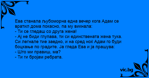 Прибрал се Адам късно вечерта и Eвa му устроила сцена на ревност. - Ти полудя ли? — ядосва се Aдaм. - С кого мога да ти изневеря? Та ние сме единствените хора на земята! Малко по-късно през нощта...