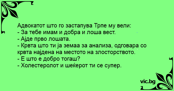 - Van egy rossz, meg egy jó hírem. mondja a védőügyvéd kliensének. - A vérvizsgálat kimutatta, hogy maga követte el a bűncselekményt. - Ajjaj! És mi a jó hír, ügyvéd úr? - Hogy alacsony a...