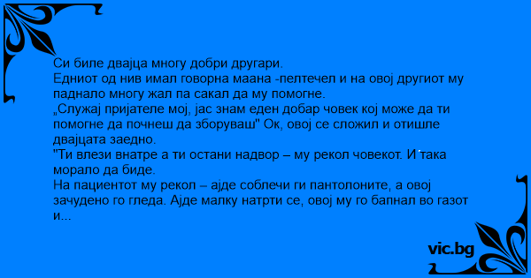 „Служај пријателе мој, јас знам еден добар човек кој може да ти помогне да почнеш да зборуваш" Ок, овој се сложил и отишле двајцата заедно.