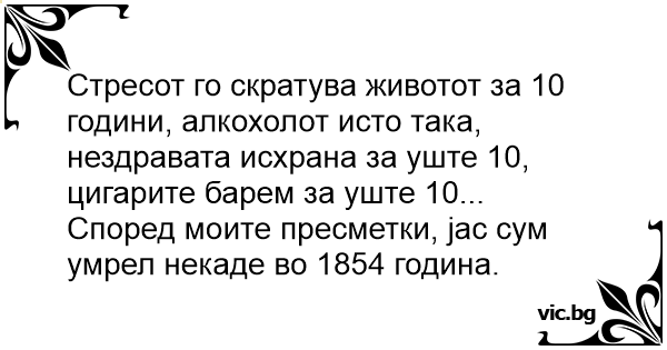 Стресот го скратува животот за 10 години, алкохолот исто така, нездравата исхрана за уште 10, цигарите барем за уште 10...