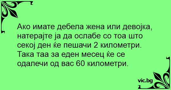 Ако имате дебела жена или девојка, натерајте ја да ослабе со тоа што секој ден ќе пешачи 2 километри. Така таа за еден месец ќе се одалечи од вас 60 километри.