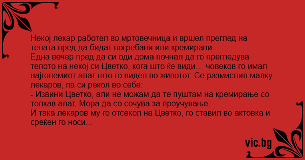 И така лекаров му го отсекол на Цветко, го ставил во актовка и среќен го носи дома. Влегол дома и прво ја викнал жена си: