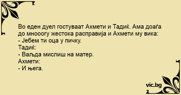 Во еден дуел гостуваат Ахмети и Тадиќ. Ама доаѓа до мнооогу жестока расправија и Ахмети му вика:
