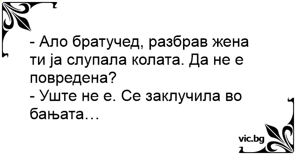 - Ало братучед, разбрав жена ти ја слупала колата. Да не е повредена?
