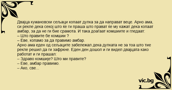 Двајца кумановски сељаци копаат дупка за да направат веце. Арно ама, си рекле дека секој што ќе ги праша што прават ќе му кажат дека копаат амбар, за да не ги бие срамота. И така доаѓаат комшиите и гледаат: