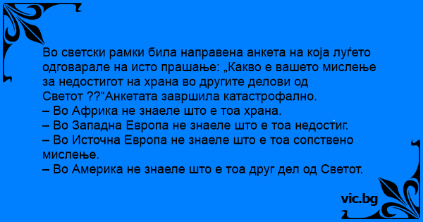 A ONU resolveu fazer uma pesquisa em todo o mundo. Enviou uma carta para o representante de cada país com a pergunta: "Por favor, diga honestamente qual é a sua opinião sobre a escassez de alimentos no resto do mundo". Mas pesquisa foi um grande fracasso. Todos os países europeus não entenderam...