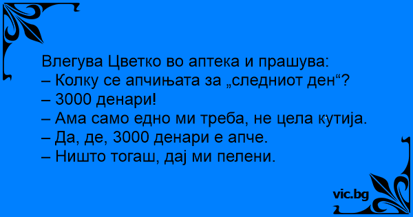 Влегува Цветко во аптека и прашува: