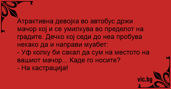 Пътува момиче в автобуса, на коленете и котка. Тя гали котето. Младеж, стоящ до нея казва: