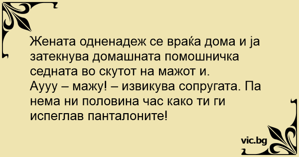 Аууу – мажу! – извикува сопругата. Па нема ни половина час како ти ги испеглав панталоните!