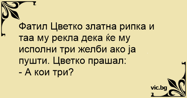 Фатил Цветко златна рипка и таа му рекла дека ќе му исполни три желби ако ја пушти. Цветко прашал: