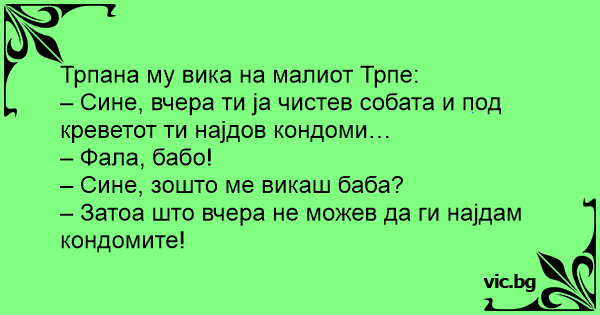 – Сине, вчера ти ја чистев собата и под креветот ти најдов кондоми…
