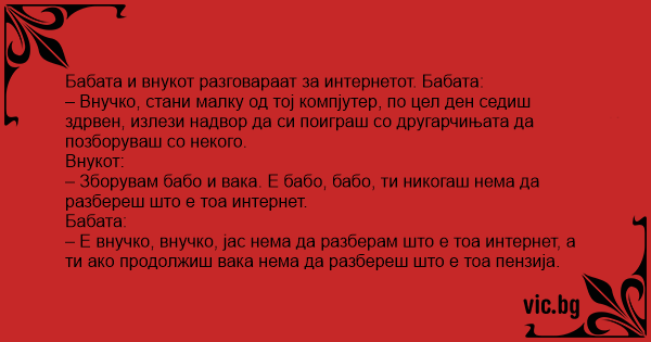 – Е внучко, внучко, јас нема да разберам што е тоа интернет, а ти ако продолжиш вака нема да разбереш што е тоа пензија.