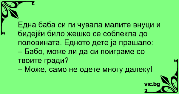 Една баба си ги чувала малите внуци и бидејќи било жешко се соблекла до половината. Едното дете ја прашало: