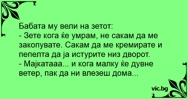 - Зете кога ќе умрам, не сакам да ме закопувате. Сакам да ме кремирате и пепелта да ја истурите низ дворот.