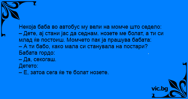 – Дете, ај стани јас да седнам. нозете ме болат, а ти си млад ќе постоиш. Момчето пак ја прашува бабата: