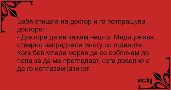 - Докторе да ви кажам нешто. Медицинава стварно напреднала многу со годините. Кога бев млада морав да се соблечам до пола за да ме прегледаат, сега доволно е да го исплазам јазикот.