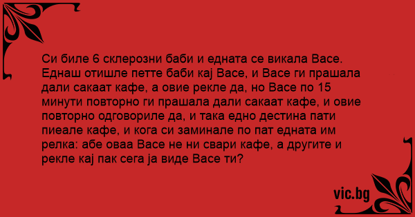 Еднаш отишле петте баби кај Васе, и Васе ги прашала дали сакаат кафе, а овие рекле да, но Васе по 15 минути повторно ги прашала дали сакаат кафе, и овие повторно одговориле да, и така едно дестина пати пиеале кафе, и кога си заминале по пат едната им релка: абе оваа Васе не ни свари кафе, а другите и рекле кај пак сега ја виде Васе ти?