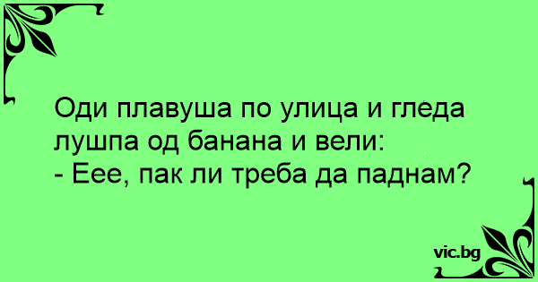 Што вели плавуша кога ќе види лушпа од банана 20 метри пред неа? - Срање, сега пак ќе паднам.