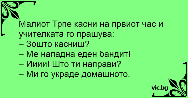 Jasiu spóźnia się pół godziny na lekcję języka polskiego. Nauczycielka pyta się go: - Jasiu, dlaczego się spóźniłeś? - Bo napadł na mnie groźny bandyta z pistoletem w ręce. - To straszne! - mówi nauczycielka - I co było potem? - Potem zabrał mi zeszyt z zadaniem domowym. Закъснява Иванчо за първия час. Учителкта го пита: Първолак закъснява за първия час. Закъснява Иванчо за час. Учителката го пита: Nauczyciel pyta ucznia: - Gdzie jest Twoja praca domowa? - Nie uwierzy pan, ale po drodze do szkoły zrobiłem z niej samolocik i porwali go terroryści. Joãozinho chegou muito atrasado na escola, e a professora perguntou: Entra Jaimito llorando a la escuela, y le dice a la profesora: ¡Me robaron profesora, me robaron! Y la profesora le dice: ¿Qué te robaron Jaimito? Y él responde: ¡La tarea profesora! Zdyszany Jasiu wbiega do klasy. Pani pyta go: - Jasiu co się stało? - Gonili mnie dwaj mężczyźni. - Jesteś cały? - Tak, ale zabrali mi wypracowanie z polskiego. Mokytoja klausia: - Petriuk, kodėl vėl vėluoji? - Mane einant į mokyklą užpuolė! - Kaip baisu! Ar kanors pavogė? - Namų darbus... Przychodzi na lekcje spóźniony Jaś, a pani się pyta: - Jasiu dlaczego się spóźniłeś? - Bandyci mnie napadli! - O Boże! Nic Ci się nie stało? - Owszem. Zabrali mi zeszyt z wypracowaniem... Pikku-Kalle tulee kouluun tunnin myöhässä. Opettaja kysyy miksi Kalle tuli myöhässä. ”Myöhästyin koska minut ryöstettiin matkalla.” ”No mitä sinulta vietiin?” ”Läksyt.”