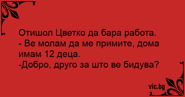 Трпе на интервју за работа. Директорот го прашува: - Во резимето ви пишува дека сте женет и имате 5 деца? - Точно. - А со рацете знаете ли нешто да правите?!