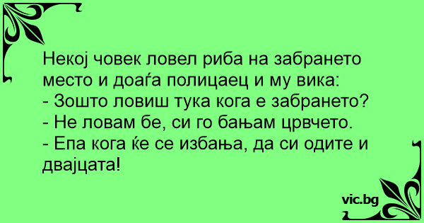 Некој човек ловел риба на забрането место и доаѓа полицаец и му вика: