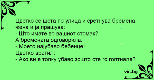 Цветко се шета по улица и сретнува бремена жена и ја прашува: