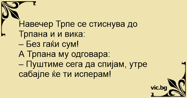 Мъжът се мушва под завивките и нежно и стрстно пршепва в ухото на жена си "Без гащи съм... La pareja en cama sin ropa interior Ляга Вуте при Пена и й казва: Il marito entra con molta cautela nel letto e sussurra appassionatamente all’orecchio di sua moglie: - Tesoro, sono senza mutande... E la moglie gli risponde: - Domani te ne lavo un paio. Sotul intra in pat Si-i sopteste sotiei la ureche: - Sunt Fara chiloti. Sotia , pe jumatate Adormita: - Lasa-ma sa dorm , maine am Sa-ti spal o pereche.