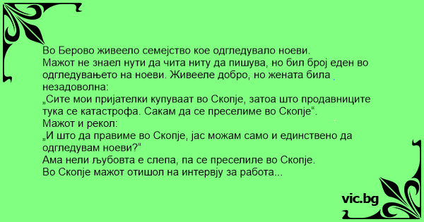 Во Скопје мажот отишол на интервју за работа како заварувач, бидејќи друга работа не успеал да најде. Му дале формулар да го пополни, но тој рекол дека е неписмен и дека не може. Му одговориле дека тогаш не може да го земат за заварувач и семејството се вратило назад во Берово.