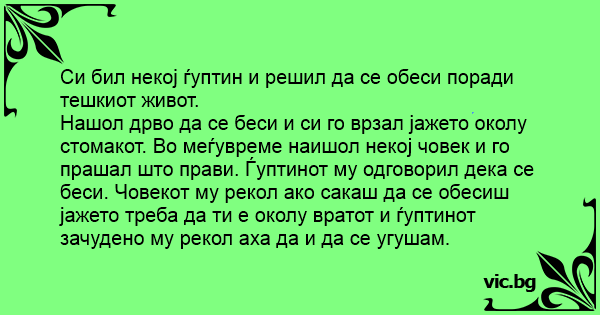 Вълкът гледа-заекът виси, завързан с въже за краката, от едно дърво. Върви си Мечо Пух из гората. По едно време вижда Прасчо вързан с дебело въже за крака, виси от едно дърво. Блондинка решава да се беси... Back a few years ago, I went over to my neighbors house.(She was a blonde), and for some reason she was mad at the world. She had locked herself in the bathroom and was threatening suicide. A blonde was sick and tired of people making fun of her for being a blonde, so she decided to hang herself. A blonde decided to commit suicide by hanging herself from a tree in the park. A few days later, a man was walking his dog and spotted her hanging from the tree. He asks the blonde what she is doing and she replies, "I'm hanging myself." "You're supposed to put the noose around your neck, not... När Frode kommer hem till Odd hänger denna och dinglar i ett rep med en snara runt armen. - Vad håller du på med, undar Frode. - Jag tänkte ta livet av mej. - Då måste du ha snaran runt halsen.... O vizinho entra na casa do português e o encontra com uma corda amarrada na barriga: — O que é isso? Por que esta com esta corda amarrada na barriga? O português responde: — Vou me suicidar! — Mas... – Varför hänger du här i ett rep runt midjan? – Jag tänkte ta livet av mig så jag satte snaran runt halsen, men då kunde jag inte andas. Det är ju livsfarligt! Så jag provar med midjan istället. A blonde really got tired of all blonde jokes and decided to hang herself in the bathroom. As she locked the door, she yelled at her husband, "I'm hanging myself because I'm tired of jokes about us... Det var en gång en norrman som skulle hälsa på sin vän som bodde i Finland... När han kom dit såg han sin vän hänga med fötterna i ett rep som var knuten till ett träd.. - Vad gör du? undrar... Dans un hôpital psychiatrique, un fou engage la conversation avec un autre fou suspendu par la taille à un arbre. - Qu’est-ce que tu fais ? - Tu vois bien, je me suis pendu. - Mais, imbécile, c’est... Intr-o dupa-amiaza un padurar trece prin codrul des si deodata vede un tigan legat la mijloc cu o sfoara atarnat de o craca. Il ia imediat la intrebari: - Tigane ce faci, ma, atarnat acolo? - Uite,... När Ole kommer för att besöka Vegard så hittar han honom hängandes i ett rep runt armen. - Vad håller du på med? Undrar Ole. - Jag försöker ta livet av mej! Svarar Vegard. - Men då måste du ju ha... Egy bolond kötelet csavar a derekára, és egy faágra köti magát. Arra megy egy másik bolond, és megkérdi tőle: - Haver, te mit csinálsz ott fent? - Láthatod! Meguntam az életem, és felakasztottam... Ein Mann beobachtet zufällig, wie sein Freund auf einen Baum klettert und sich dort einen Strick um die Brust bindet. "Was machst du da?" - "Das ganze Leben kann mir gestohlen bleiben! Ich hänge...