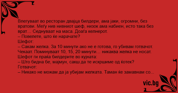 Влегуваат во ресторан двајца билдери, ама јаки, огромни, без вратови. Меѓу нив нивниот шеф, низок ама набиен, исто така без врат… Седнуваат на маса. Доаѓа келнерот.
