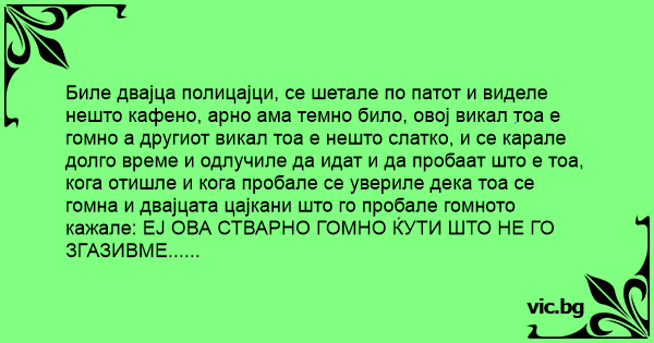 Биле двајца полицајци, се шетале по патот и виделе нешто кафено, арно ама темно било, овој викал тоа е гомно а другиот викал тоа е нешто слатко, и се карале долго време и одлучиле да идат и да пробаат што е тоа, кога отишле и кога пробале се увериле дека тоа се гомна и двајцата цајкани што го пробале гомното кажале: ЕЈ ОВА СТВАРНО ГОМНО ЌУТИ ШТО НЕ ГО ЗГАЗИВМЕ......