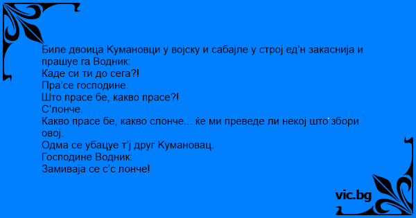 Биле двоица Kумановци у војску и сабајле у строј ед’н закаснија и прашуе га Водник: