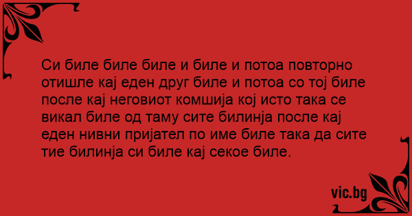 Си биле биле биле и биле и потоа повторно отишле кај еден друг биле и потоа со тој биле после кај неговиот комшија кој исто така се викал биле од таму сите билинја после кај еден нивни пријател по име биле така да сите тие билинја си биле кај секое биле.