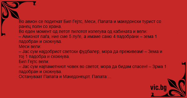 – Авионот паѓа, ние сме 5 луѓе, а имаме само 4 падобрани – зема 1 падобран и скокнува.