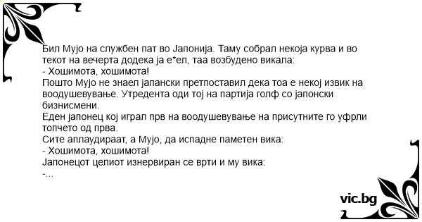 Бил Мујо на службен пат во Јапонија. Таму собрал некоја kуpba и во текот на вечерта додека ја е*ел, таа возбудено викала: