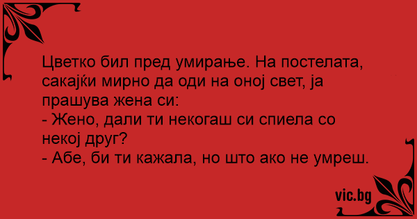 Помирає старий єврей. Біля ліжку дружина. - Сара, я помираю. Скажи правду: ти завжди мені була вірна, ніколи не зраджувала? - Абрам, як ти можеш у таку хвилину! А раптом ти не помреш? ..