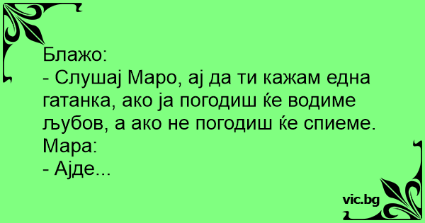 - Слушај Маро, ај да ти кажам една гатанка, ако ја погодиш ќе водиме љубов, а ако не погодиш ќе спиеме.