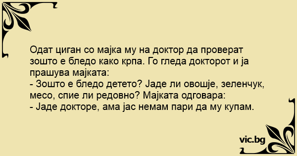 Одат циган со мајка му на доктор да проверат зошто е бледо како крпа. Го гледа докторот и ја прашува мајката: