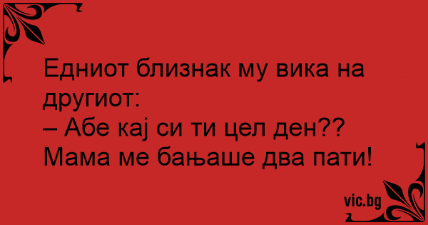 – Абе кај си ти цел ден?? Мама ме бањаше два пати!