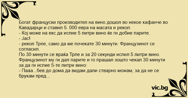 Французинот му ги дал парите и го прашал зошто чекал 30 минути за да ги испие 5-те литри вино: