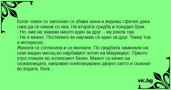 Жената се согласила и се венчале. По свадбата заминале на скап меден месец во најубавиот хотел на Маурициус. Првото утро отишле во хотелскиот базен. Мажот се качил на скокалницата, направил комплицирано двојно салто и скокнал во водата. Кога испливал, и рекол на невестата: