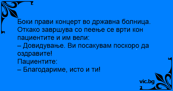 Боки прави концерт во државна болница. Откако завршува со пеење се врти кон пациентите и им вели: