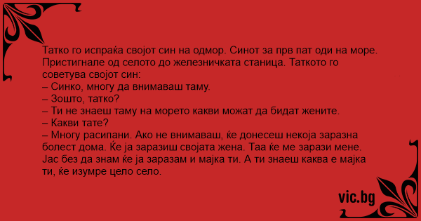 батько наставляє сина перед виїздом на курорт: -ти ж синку там... Бащата наставлява сина преди да отиде на почивка: